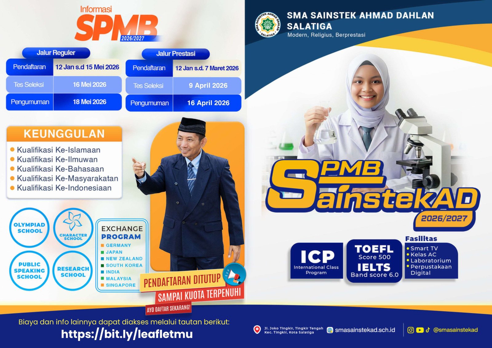 Penerimaan Murid Baru SPMB SMA SAINSTEK AHMAD DAHLAN SALATIGA Tahun Ajaran 2026-2027 SUDAH DIBUKA.Segera daftarkan putra/putri Ayah Bunda untuk bergabung di keluarga besar SMA SAINSTEK Ahmad Dahlan Salatiga. Pendaftaran 📂…